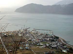 見下ろすと尾上港が眼下に。奥琵琶湖が見渡せる。向こうは葛籠尾崎。