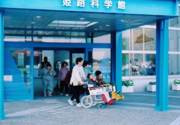 | 鷹尾さんの手をひっぱってバスへ急ぐ美佐子さん | 車いすでの館内見学でした |