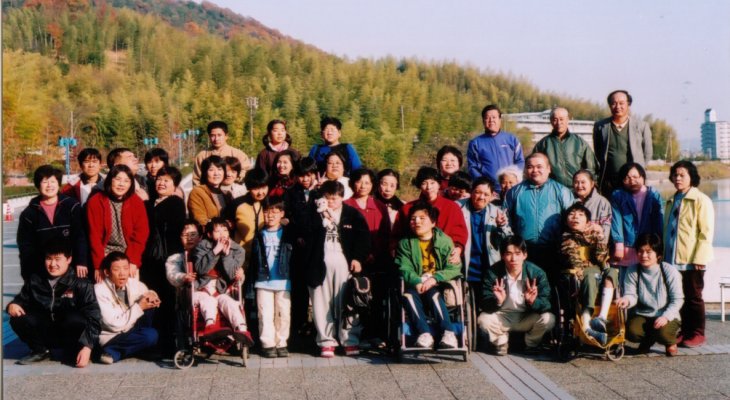 | 入口前での集合写真(以下の写真は、館内写真撮影禁止の為、帰る時の写真です) | |