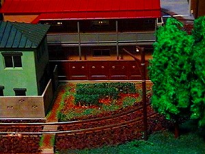 建物にはGMの「塀」をめぐらせて実感的に見せ、樹木(4本)は園芸用の乾燥水苔をポスターカラーで緑に着色してつまようじに接着して作りました。バラストはレギュラーコーヒーの出しがらを使いましたが、これはボンドを吸い込んで膨れ、乾燥後に縮んで隙間が空くので、あまり良くありませんでした。土の地面や畑はシーナリーパウダーで表現。道路の白線は車輛ケース用のシールの余り(縁の部分)を長細く切って貼りました。(黄色の線はマスキングテープを使用。) 最後に人形やミニカーで街のにぎやかさを表現しました。
