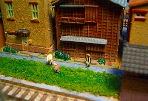 ミニシーンH 線路脇にて:「ここに畑作ろうか?」「そりゃええなあ。」「こんだけの広さでもけっこうできそうやで。」