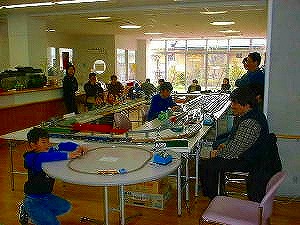 宝塚で第4回目の公開運転会を開催しました。今回は宝塚市立大型児童センター兼老人福祉施設「フレミラ宝塚」の1階「子育て情報サロン」を借りて行いました。かなりの広さがあり、今までで一番余裕を持ってレールが敷けました。今回もHOゲージとNゲージを一緒に走らせました。子育て情報サロンにやって来ていた親子連れや、児童センターに遊びに来ている中学生たちが見に来てくれました。