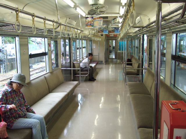 | 御坊からのランナー・・103系を改造した物と分かります。 | その車内・・古めかしいボックスシートの車内ですが、トイレもありバリアフリー機能を備えています。 | ||