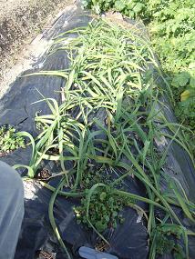 2010/5/29 玉葱の茎を折り、葉への栄養補給を遮断 |