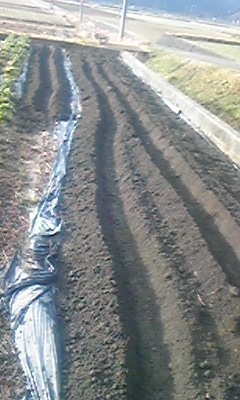 | 1月中旬に下準備していた日当たりよく、水はけの良い場所に浅く植え付けました。 | |
