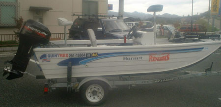 ホーネット420(拡大)以前の店長号です。 マーキュリー40馬力搭載。 トレーラーはイージーローダーです。 |