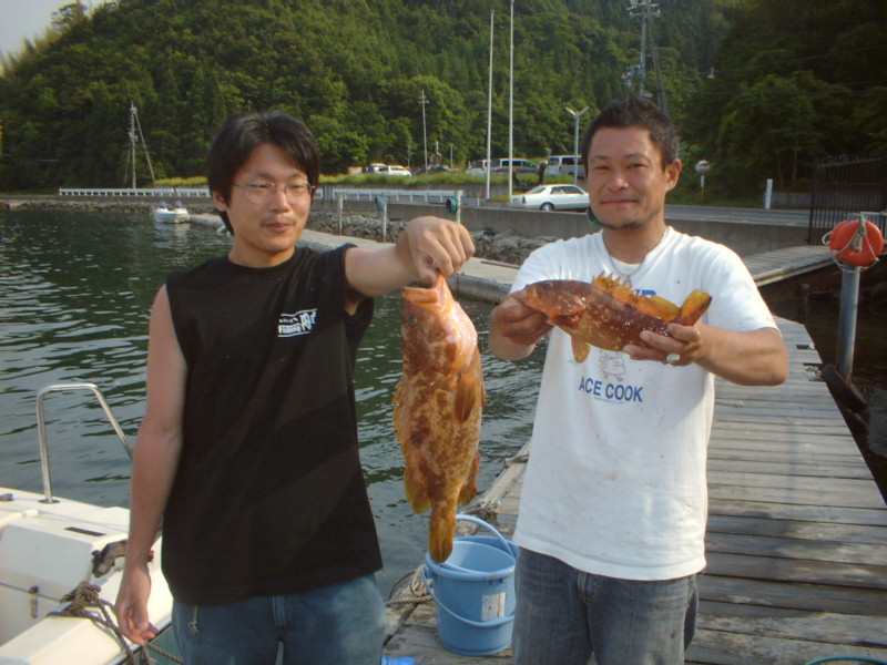 | その後、沖合いに青物を狙いに行きましたがボイルが出るのですがすぐに 沈下してしまうのでなかなかHITまで行きませんでした。 気分転換に根魚を狙いに行きました。浅瀬で狙ったらガシラの小さいのと ベラしか釣れないのでもう少し深場で狙ってたらまず僕にガシラの30cmぐらいのがHIT その後、桑原君にアコウの50cmがHIT!吉田君は、、、、、のまま頑張ってました。 でもさすが吉田君!その後アコウの25cmをHIT!真剣に喜んでました。 |