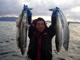 | 出航しましたが湾を出るところは中々の波!ワイパー全開でポイントに向かいました。 ポツポツ釣れてるというのはアクアノートさんから連絡いただいてたので 場所はすぐにわかりました。魚探に中間ぐらいに本命らしき感度あり 釣り始めたらすぐにHIT!太ったサワラです。浅海船長も僕も西嶋君もHIT! しかし西嶋君の容子がおかしい!口をパクパクさせ顔が青白い!お前は鯉か?? 俺と船長はご機嫌で爆釣り!めっちゃ楽しい!サゴシではなくサワラばっかり!! 船酔い君も死ぬ気で上から吉野家をまき餌にしてサワラを釣ってました。 浅海船長も仕事ではなく釣りだったのでめっちゃ楽しそうに釣りを楽しんでました。 |