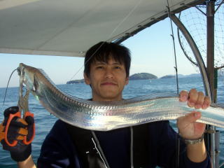 | 始めの1流しからポツポツHIT!少しい小さいのが多いですがほとんどの人が 太刀魚ジギングが始めて大喜びでした。ジグは80Gから100gぐらいで ゴールド系が反応がよかったです。 指4本クラスも混じりよく引いて楽しいです。 その中から指5本サイズのドラゴンみたいなのもみんな混じって喜んでました。 |