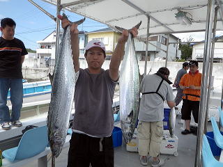 | 少ししてから沖合いに出てタチウオジギング開始!ココ最近は???な釣果で心配 でしたがまぁ頑張るしかないのでやってみました! 僕はシャウト。ライテン90Gのゴールド系で狙いました。 水深は40mぐらいです。 早速1投目でHIT!2投目でもHIT!タチウオジギング初挑戦の西嶋君もHIT! でもデカイ!90cmのデカサワラ! その後、1入れ掛かり状態!フォールでもガンガン当たってきます! 指3本から4本サイズが主ですが入れ食いは面白い^^ みんなワイワイいながら楽しんでました! |