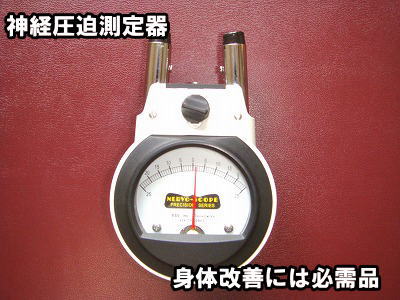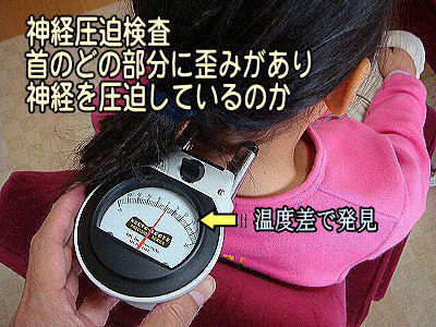 まず神経圧迫測定器(ナーブスコープ)によって、首のどの骨(関節)がズレて炎症が起っているのかを発見しなければなりません。炎症を起こしている部分は温度が高い為、その皮膚に機器を当てると針が振れて反応します。原因箇所を特定しないと首痛(むち打ち症)や痺れの治療は出来ません。