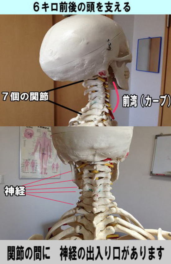 しかし、長時間のパソコン・携帯電話使用の身体に負担がかかる姿勢、急激な首の捻じれや、急に重たい物を持ち上げたりする場合に、個ある骨(関節)のうちどれかが動きが悪くなる(ズレ)と、自分自身のキロ前後ある頭を支えるには柔軟性が損なわれ、その骨から出ている神経を圧迫します。神経の流れが悪くなる。すると炎症が起こり痛みとしてSOSを発信します。