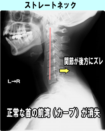 最近はパソコンや携帯電話を長い時間使っている人が多く、使用する姿勢が、頭が前方に傾き、重たい頭を常に首で支えなければならない為、頸椎(首)に負担がかかります。写真のように正常な首のカーブ(前湾)が消失してストレートネックになっていることが多く、頭を支えるには効率が悪く、常に筋肉が緊張状態にさらされていることで、首のこりなどの症状が現れることが多いです。ストレートネックになっている首の原因箇所を見つけ、正常に動くよう的確な施術をおこない、改善に向かわせることが大事です