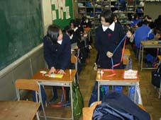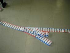 01年1月31日 生きている時間は短いけれど、生命は永遠である。 葉っぱのフレディーで学んだこのフレーズの意味を考えるために クラス全員でDNAの模型をつくりました。 まず青と赤の2本のテープを配り、AT、TA、CG、GAの塩基 を貼り付ける作業をしました。