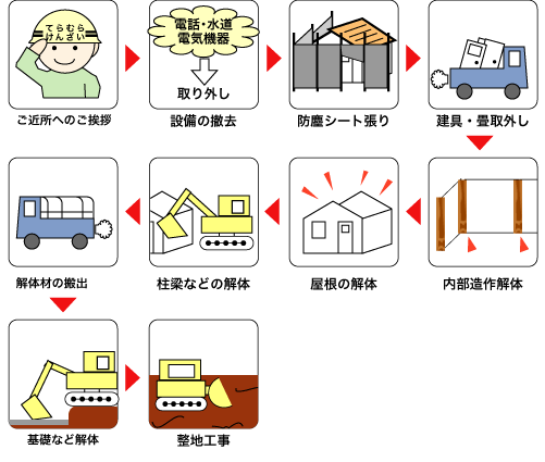 取り壊し(解体)はこんな順序・作業で進められています。