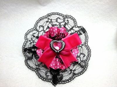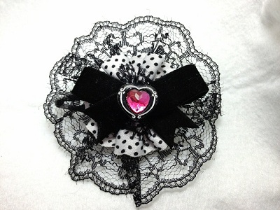 ブラックレースパッチン留めA モチーフの大きさは 約6cmの円形です。 ベロアのリボンにハートのパーツをデコしました。ちょっとギャルっぽくなりました。 大きめなので、アクセントになります。 色違いのピンクもあります。 |