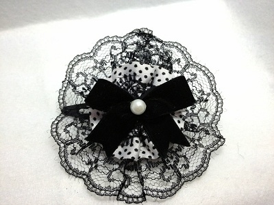ブラックレースパッチン留めB モチーフの大きさは 約6cmの円形です。 ベロアのリボンにパールをあしらってみました。 大きめなので、アクセントになります。 |