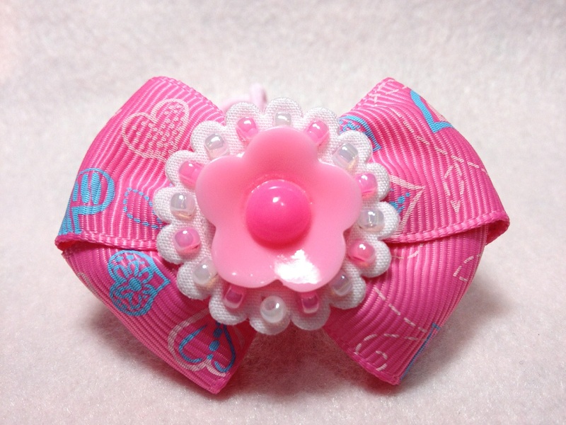 ピンクのハートリボンに お花とビーズのモチーフ付 たて:4.5cm×よこ:6cm ハートのリボンで作りました。 お花のモチーフにビーズをあしらって みました。 |