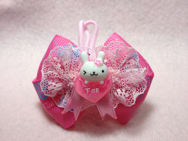 うさぎとレースのモチーフ付 ピンクハートのリボンヘアゴム たて:4.5cm×よこ:6cm ハートのリボンで作りました♪ とてもラブリーな商品です。 |