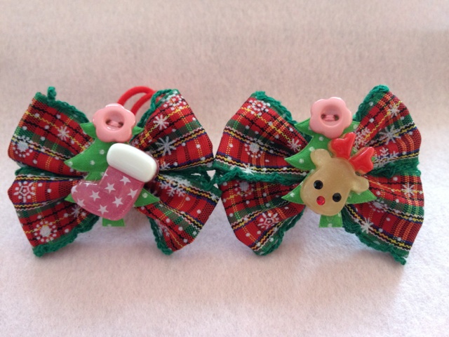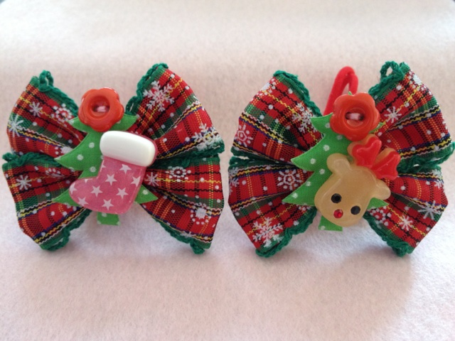 クリスマスのりぼん トナカイ&長靴(ピンク) クリスマス用のヘアリボンです。 クリスマスカラーのリボンに ・もみの木&トナカイ ・もみの木&長靴 を飾ってみました♪ たて5cm×よこ6cm *こちらは2個セットの価格です。 |