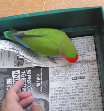 最初は薄い紙、新聞1枚〜2枚ぐらいしか噛みませんでしたが、徐々に「もっと分厚くしてくれぴ!」と言うようになり、今('11/2月)は4枚ぐらいが一番噛みやすいようです。 紙の厚さが気に入らないと、近くの人間の顔を見ながらクチバシで何度も紙を弾いて紙の交換を訴えるんですよ! 「オラオラオラ!早く換えろぴーー!」 みたいな感じ… 人間だったら嫌な人ですねえ(笑) |