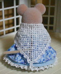 初めて作ったデザインの苦手な、ふりふりドレスです。青い柄のスカートは、元ハンカチでしたが気に入りすぎて使えず、ずいぶん長い間(数年間)タンスで眠っていたものです。