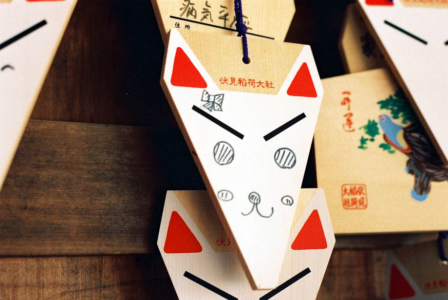 絵描き魂っ! 狐の絵馬にこんな事をするとは、考えたなぁ。ちなみにこれも狐に摘まれながら撮影した写真。 伏見稲荷は絵馬の他にもやたらと種類の多い御神籤など、面白いものがたくさんあります。
