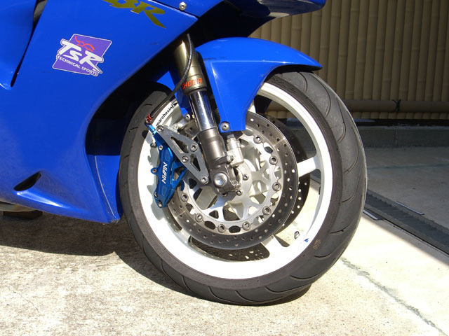 ![]() | フォークはVTR SP-1用を専用ステムを製作して取り付けてます。 ブレーキキャリパーはNISSIN削りだし6ポットです。 ブレーキディスクはNISSINのAC91M用320mmです。 ホイールはマルケジーニのM5Rです。 リアサスのスペシャルリンクを着けた事でリアの車高が上がり、 フロント加重が増えて倒立フォークの剛性は充分に生きてます。 |