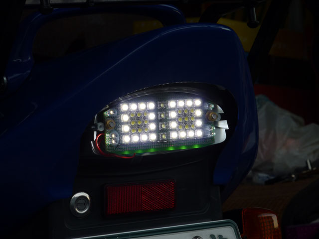 ![]() | 日亜化学の雷神NSPWR70CS-K1が46灯。 横向きとナンバー灯に砲弾型のNSPW510DSを6灯ずつ。 元々のフィラメント球は赤カバーの側面も照らす構造の為に 横向きのLEDを配置しました。 雷神は照度ランクのP8とP9が混ざってます。 テールライト時の減光はオーディオQの減光キットを使ってます。 |