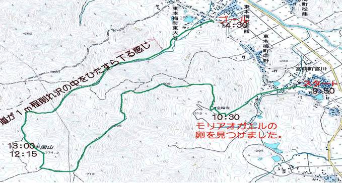 これから半国山を目指して、再出発。春にも登られた方が、「ここから登ります。」と、指差された先を見れば、「うそ−、こんな中に入るの。」と、声が上がったほどのブッシュ。仕方なしに続いて入ると、しばらくすると、足がふかふかする心地よい山道、太陽をさえぎる緑の樹木の中を20分、30分、息がだんだん荒くなり、額から汗がひたたり落ちてくる。 長い事、山歩きをしていなかった身に、しんどさが押し寄せてくる。「こんなの参加しなかったら良かった。」、「こんなしんどい思いして、あほちゃうかー。」と、後悔がシャボン玉のように、出来てはこわれる。 ついて歩かなければ。ハァー、ハァー、ゼィーゼィー、息苦しさがますます激しくなる。ようやく、頂上まで300mの標識。 後すこし。 ワァー、見上げるような登り道。 何とか登り終え頂上に。大声で「登った!!!!」と、叫びたい心境であったが、先客もおられ、早速、昼食。そよ風を受け、妻が作ってくれたおにぎりをほおばる。うまい。 梅干やしそのすっぱさが何とも言えないほど美味しい。 二人の方がコンロを持参されており、食後にコーヒーまで戴いた。