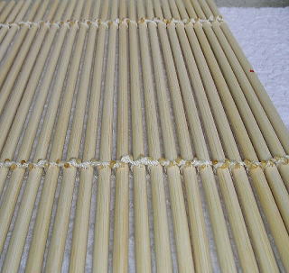 ![]() 俊丸の玉すだれは、購入した竹ひごを一本、一本丁重に穴をあけ、バリ取り、竹端を少し削った手作りの品です。 糸を通し、ロウソクの炎で焼き切り、一本ずつ結んでいきます。 |