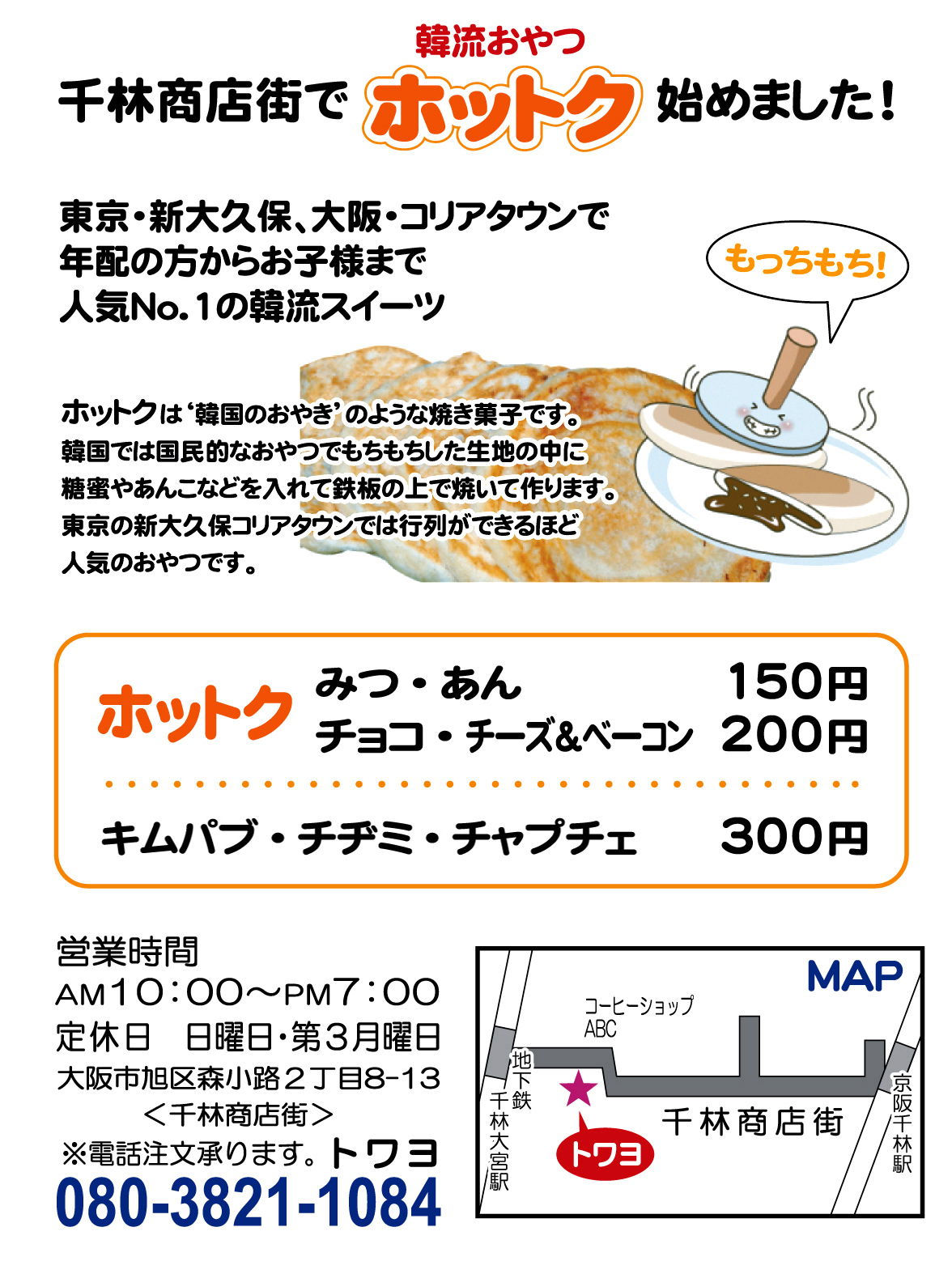 大阪市旭区の千林商店街で韓国で人気のおやつ「ホットク」を販売しています。