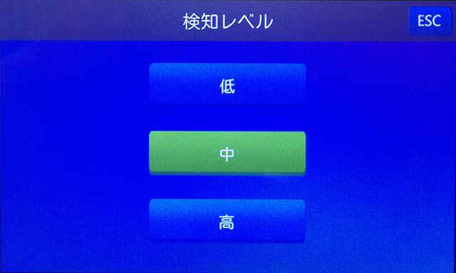 動体検知レベルを高、中、低から、検知録画時間を1分、3分、5分から選択できます。