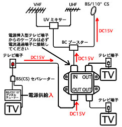 - 一つのOUT端子から、IN端子側の衛星アンテナやブースターに電気(15V)を送ることができます。