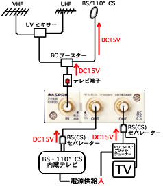 - すべてのOUT端子から、IN端子側の衛星アンテナやブースターに電気(DC15V)を送ることができます。(電気容量 0.8A)
