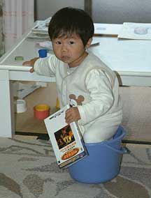 バケツに入っちゃだめ! と言っても入っちゃった. しかもすまして本なんか読んでる. もちろん字は読めない. そして予想どうり次の瞬間にはひっくり返ってる. このバケツはフジフィックス溶解用のバケツなんだが 近頃はもっぱら彼に踏み台として使われている.