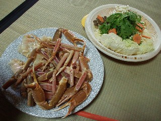 山盛りのカニ、カニすき用の野菜盛り、カニすき用の土鍋(出汁が入っているから確かだろう)。