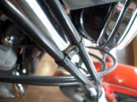 2本が平行に並ぶブレーキホース等の固定に使う方法です タイラップを1本使用し、間に径の細いホース等を使います 画像の物はアースケーブルの銅線を抜いた皮膜です |