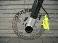 | なんと!フローティングディスクです 自転車にもこんなのがあるんです ワイヤーロックも抜かりなく・・ インナーチューブにはストロークを簡単に確認できる様に○リングを付けました フロントはマグラ グスタフM リアはシマノ XL 自転車のくせに4ポットです |