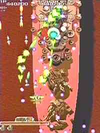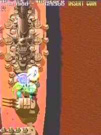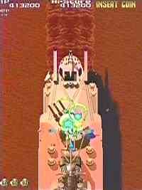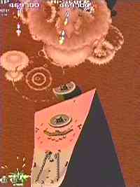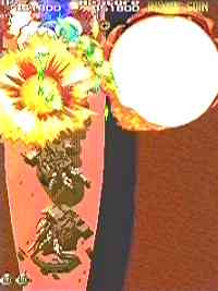 まず、画面上から雷鳴が登場してきますが、まずロックするのは、一番後ろの大型砲台。そしてぴったり張りついて連射。 周りの小型砲台も、一緒に破壊しておいた方がいいでしょう。 |
