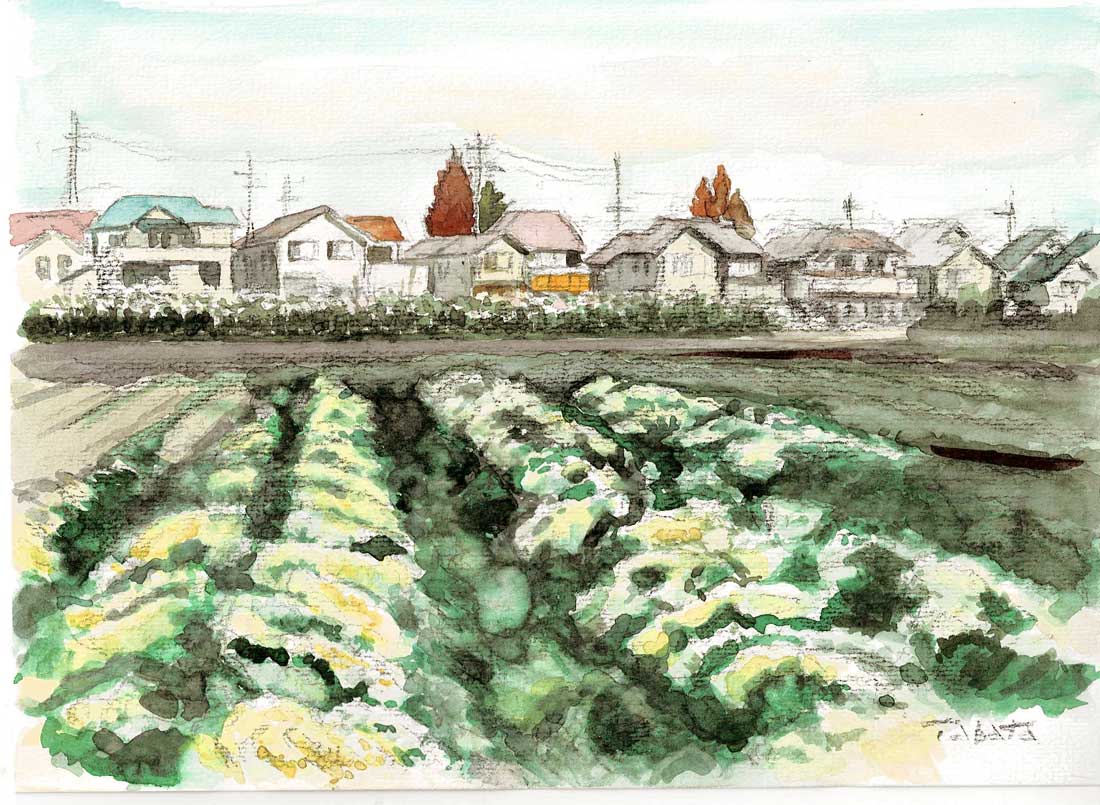箕面市石丸あたりの畑地の中から東方を眺めて描いた。もう彼岸間近というのに気候はまだ夏。住宅地の合間に畑地が残る優しい風景の中、青い家と入道雲が印象的な夕刻前。 (2024.9.13) | |