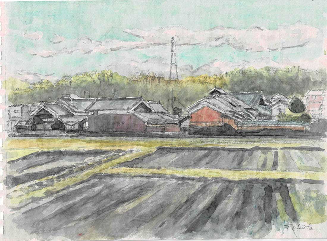 立杭焼きの今田近く、畑の中に建つ民家がなんとなく気がひかれて描く。(2025.2.18) | |