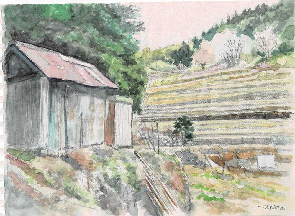 茨木市高山の棚田を描く。寂しげな冬の棚田だが、手前の小屋の古くひなびた雰囲気が少しの温かみを感じさせてくれる。(2026.1.28) | |