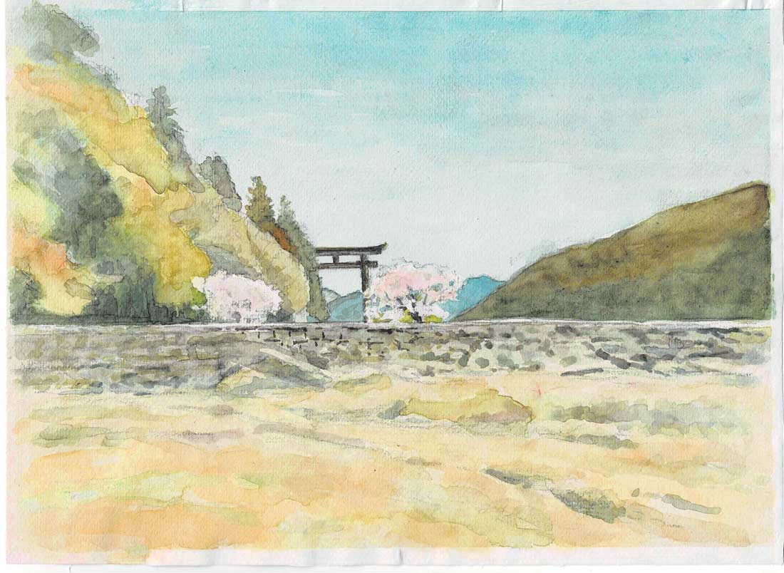 熊野本宮大社の大鳥居の遠望である。鳥居を挟んで両脇の桜が印象的。画面左の木立の向こうは大斎原(おおゆのはら)といって、大洪水で流されてしまう前、熊野本宮大社が鎮座していた場所で、今も何とも荘厳な空間であった。この絵は、熊野川の河原に面した空地から描いたもの。(2026.3.21) |