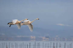 | 初日の出を撮り終えて志那浜に戻ると、すでに第二群(7:02)、三群(7:12)が飛来し湖面には30羽が浮かんでいた。(7:14写真5) なかなか二兎は追えないものである。 7時15分第四群6羽が突如西正面から現れた。少しもやっているせいか相当近づかないと飛来に気がつかない。発見直後の写真6から着水の写真10までたったの5秒間であった。今朝は無風なので、コハクチョウは旋回せずに直接着水するのでもったいない。しかし朝陽に映えた比良山をバックにコハクチョウが撮れたのは幸いであった。 |
