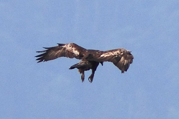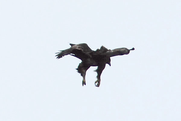 | 今日は滋賀県野鳥の会の探鳥会で、8時過ぎJR醒ヶ井駅に11人が集合した。天気は良く絶好の探鳥日和と思われ た。車に分乗し伊吹山ドライブウエーを上るにつれ霧が出だし8合目の駐車場に着いた頃は20m先が見えないほどの濃霧が立ち込めていた。頂上に向ってお花畑の側道を登り始めると風雨になったが何とか頂上にたどり着いた。暫く待っていたが霧が晴れないので下山することになった。駐車場に戻ったころには霧も徐々に晴れてきた。 ドライブウエーの途中で車を止め昼食をとることにした。この辺りは滋賀県と岐阜県の県境で北には前山があり、尾根が北方へと延びている。尾根の西側は開けていて琵琶湖の竹生島、葛籠尾崎が遠くに見渡せる。昼食中突然、前山上空にイヌワシが現れた。直ちに全員が観察体制に入り、その後もう1羽も出現し約3分強の風の精イヌワシの舞を堪能した。その後さらにハヤブサが出現し獲物を見つけて急降下する場面にも遭遇した。本日の探鳥会は「終わり良ければ全て良し」となった。 |