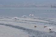 2月も中旬を過ぎるとコハクチョウはいよいよ北に帰る準備が始まる。今冬は東北、北陸地方の異常な大雪で、餌が充分に採れずに南下せざるをえず、琵琶湖岸全体では1月15日に例年の3倍弱の905羽を数えた。ここ草津志那浜でも1月12日に最高の140羽に達した。その後2月中旬までは80〜90で落ち着いていたが、徐々に減り始め、23日は34羽、24日13羽、28日に2羽となり、3月1日は終にゼロとなった。それでもその日には未だ近くの赤野井湾に2羽、野洲川河口に5羽が確認されている。