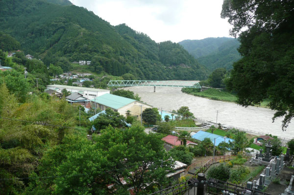 写真1 天龍村第1のポイントの全景、前日の大雨で天竜川が増水している