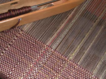 このベストの経糸にも 数本のインド茜で染めたシルクを入れた。 |