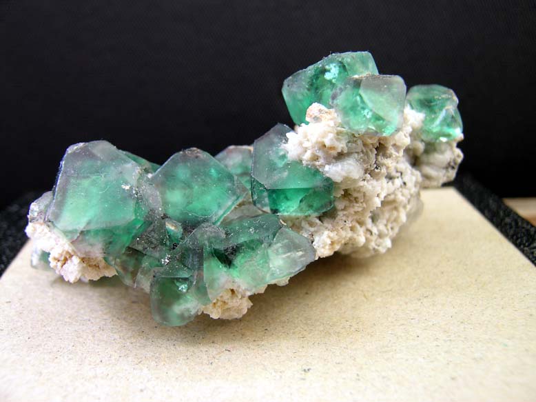 ナミビア産の蛍石は紫とか緑色が重なった微妙な色合いのものが多いが、これは珍しく緑一色。それと蛍石の蛍光はほとんど紫色だが、この標本は明るい緑色に蛍光する。標本のサイズ WXDXH 5.5x2.8x2.5センチ。